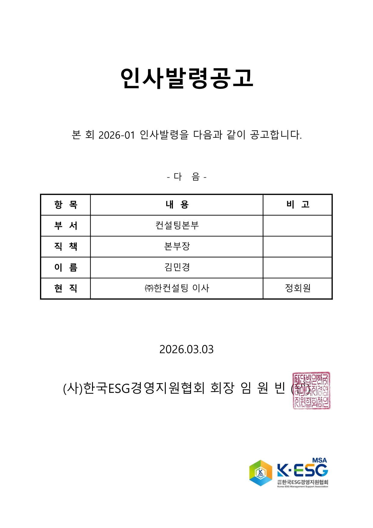 본 회 2026-01 인사발령을 다음과 같이 공고합니다.